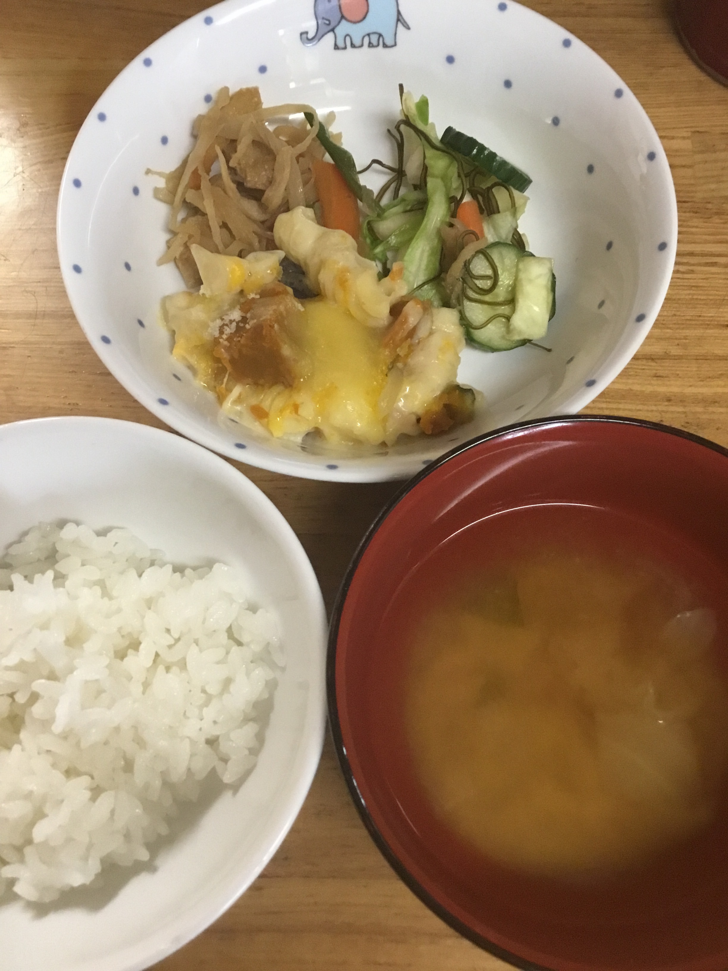 車麩の旨煮、炒めなます、きゅうりとキャベツのサラダ、味噌汁、ごはん。